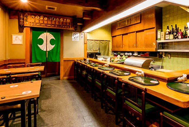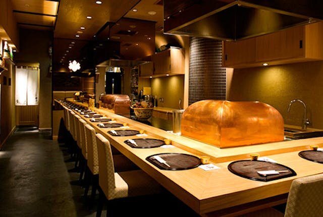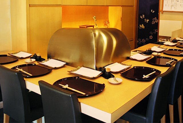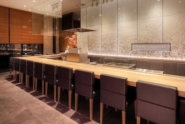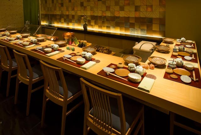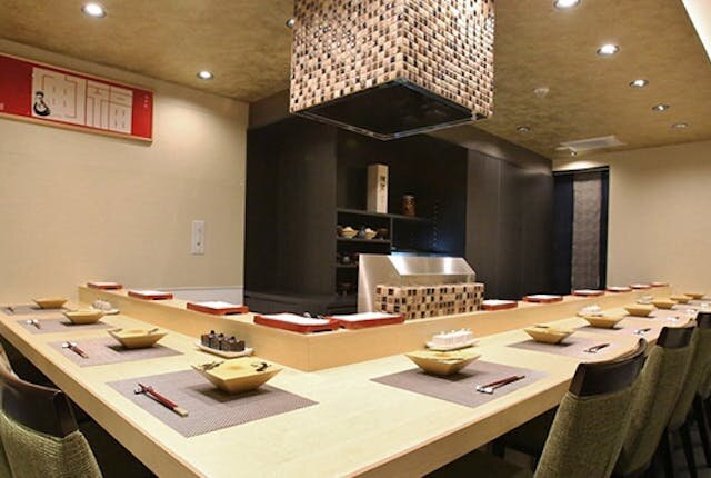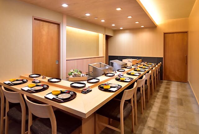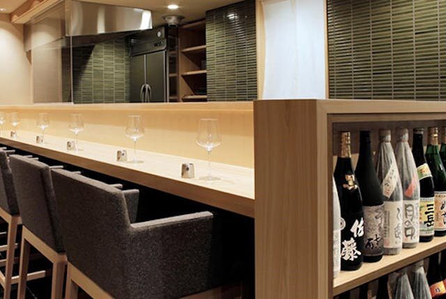 ビルの地下にあり、入口はひっそりとした隠れ家のような外観をしているのが特徴的。店内はゆったり座れる椅子が並ぶカウンターと個室が6室ある、シンプルな和の空間となっています。