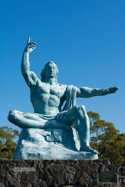 公園のシンボルは、高さ10mにも及ぶ巨大な平和祈念像。右手で「原爆の脅威」、左手で「平和」を表し、犠牲者の冥福を祈っています。