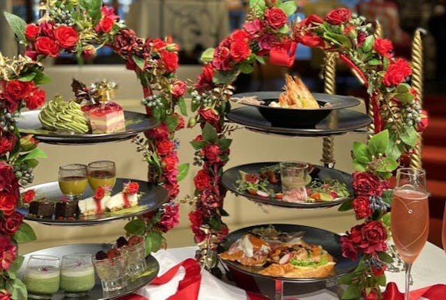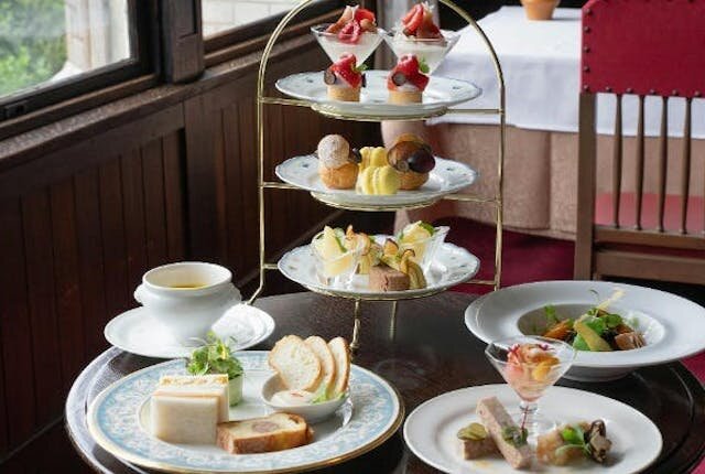 カフェタイムにはゆったり楽めるアフタヌーンティセットがヨーロッパの街並みをイメージした優美な空間を彩ります。