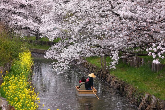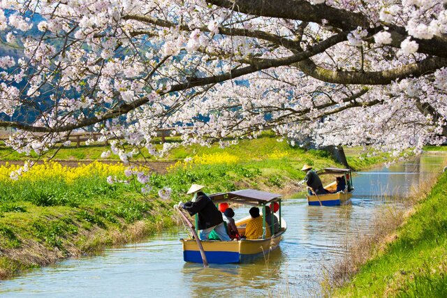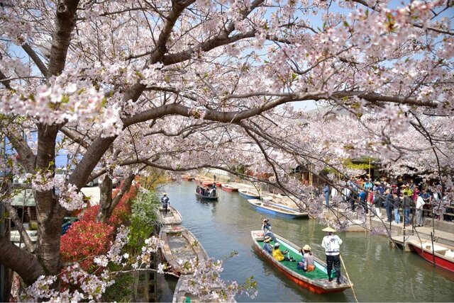 桜の見頃は3月下旬から4月上旬。なかでも散り始めの時期は、水面に花びらが広がり、「花筏」と呼ばれる景色が見られます。その中を舟で進む体験は、とても幻想的です。