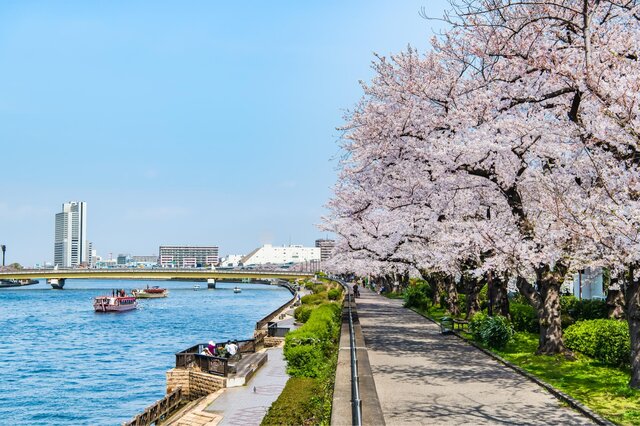 桜の見頃は3月下旬から4月上旬。川の両岸を約4,800本もの桜が埋め尽くす景色は圧巻の一言。橋の下をくぐるダイナミックな体験や、ビル群との対比も都会ならではの絶景です。