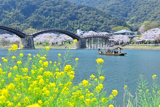 錦帯橋は、日本三名橋の一つに数えられる、美しい5連アーチの木造橋。春には遊覧船「さくら舟」が運航され、名橋を川面から見上げる優雅なひとときを楽しめます。