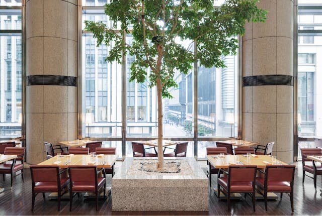 店内には25mの吹き抜けと壁一面に設けられた窓があり、開放感抜群!ディナータイムでは、窓の外に広がる日本橋のビル群を眺めながら、上質な料理を楽しめますよ♪