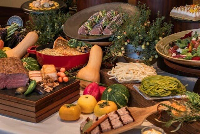 和洋中の料理が約100種類並ぶブッフェを開催しています。自慢のメニューは、富士の溶岩石を使った溶岩窯・武藏窯で焼き上げられるグリル料理。牛や豚、鶏といったお肉や、真鯛や海老などの魚介類、季節の野菜、ピザなど多彩な食材をグリルを味わえます♪