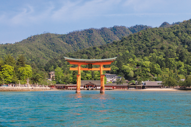 日本三景のひとつ「安芸の宮島」にあり、海上に浮かぶように建つ朱塗りの大鳥居がシンボルの日本屈指の神社。