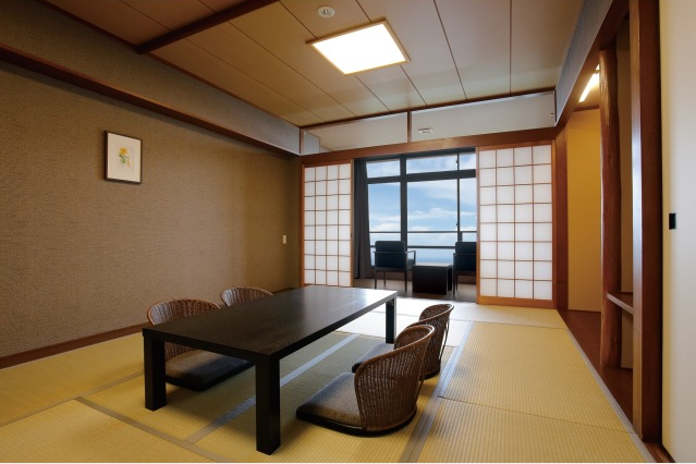 露天風呂付客室は全室オーシャンビューで、『行幸の湯』源泉掛け流しのプライベート露天風呂付のスイートルーム。客室内のタオルは全て今治タオル、アメニティーはBVLGARIを使用、ホテル内でも更にワンランク上の客室です。