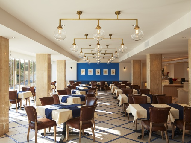 昼間は青い空、碧い海、真っ白な白良浜を望むカフェラウンジとして、夕暮れ時はラウンジ中がオレンジ色に染まる幻想的なマジカルアワーを体験出来る。