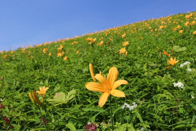 6月下旬~7月中旬にかけて咲くニッコウキスゲは、高原を黄金色に染め上げる初夏の風物詩。「天空回廊」と呼ばれる階段を登れば、360度の絶景に出会えます♡
