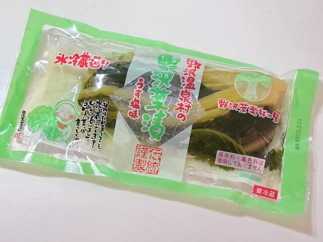地元で採れた新鮮な野沢菜を塩漬けにし、程よい酸味とシャキシャキとした食感が特徴の漬物です。手頃なサイズで販売されているので、ご飯のお供やお酒のおつまみにもぴったり!