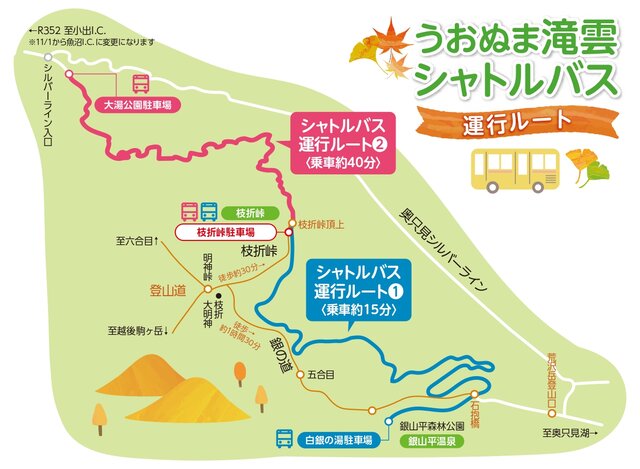一番混雑する秋は便利な「うおぬま滝雲シャトルバス」(事前予約不要)が運行します。