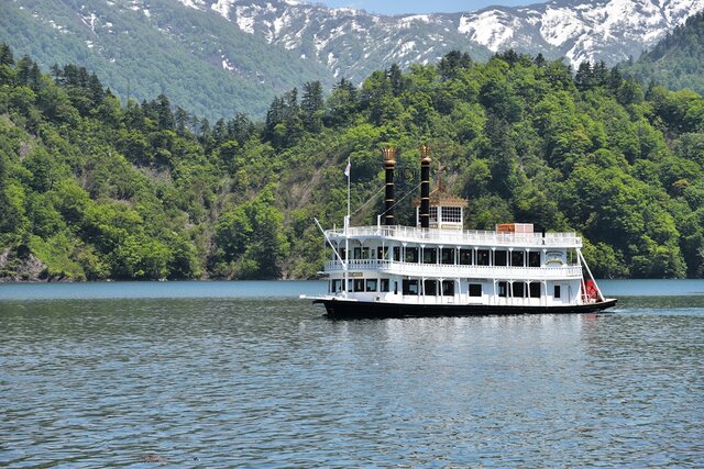 ファンタジア号は奥只見湖のシンボルとも言える、300名乗りの大きな外輪船。