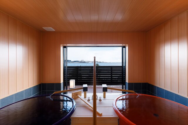 貸切風呂は2つあり、「湖の湯」は柴山潟を望むお風呂で、赤と黒の湯釜を備えているのが特徴。