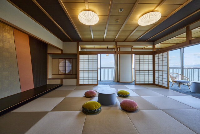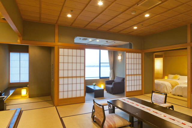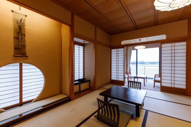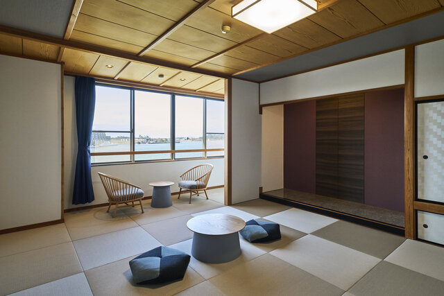 紫水館の「コンフォートコーナールーム 湖灯(KOTO)」は、和室と広縁からなる和モダン客室。