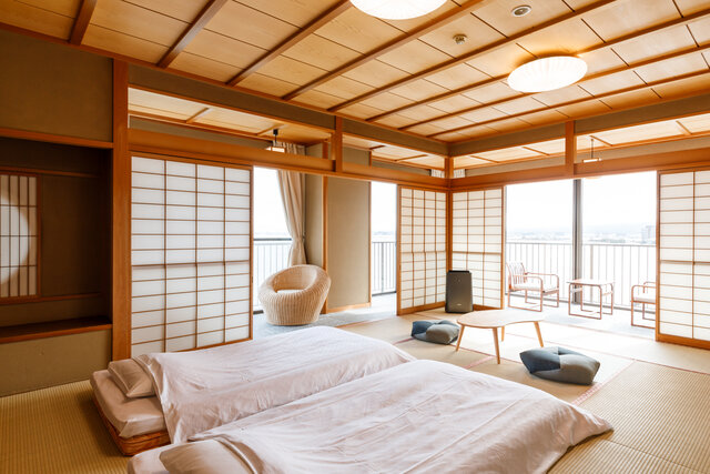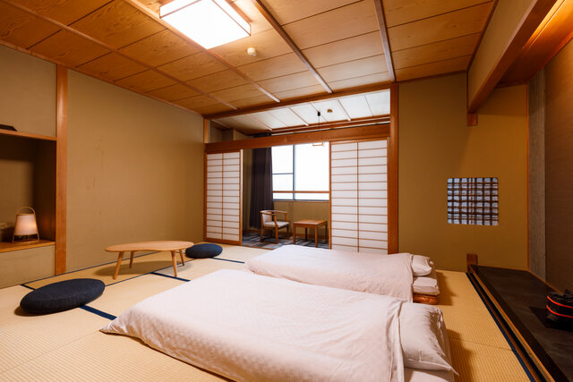 閑雲棟の「和モダン客室特別室」は、12.5畳の和室・ベッドルーム・広縁・浴室・トイレを備えた客室。