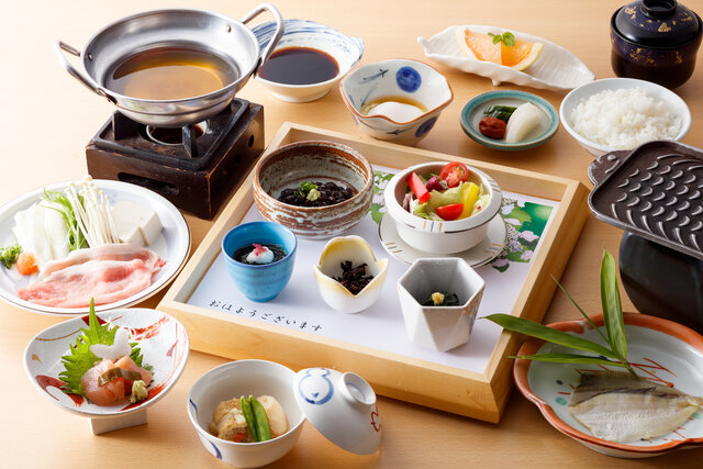 柴山潟を眺めながら味わう和朝食は、季節の焼魚や野菜の炊き合わせ、小鍋仕立ての味噌汁など、体に優しいラインナップです。