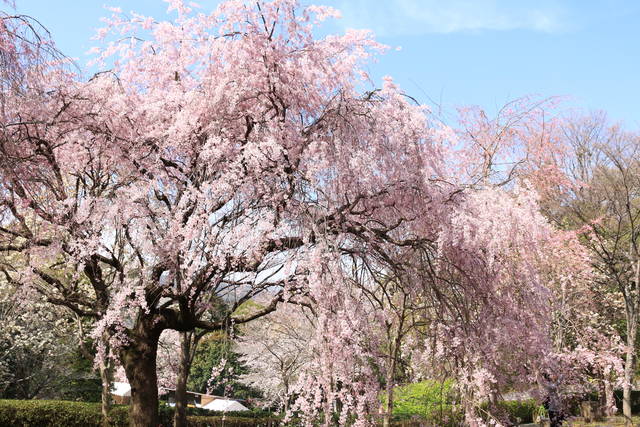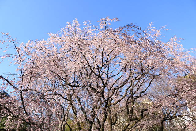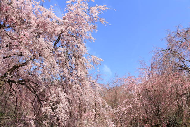 薄紅色の花が流れ落ちる滝のように咲き誇り、桜が上から降ってくるようで圧倒されます。