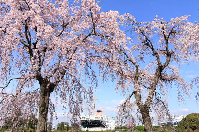 ソメイヨシノより少し早く見ごろになるしだれ桜と氷川丸のコラボがまさにフォトジェニックなんです!