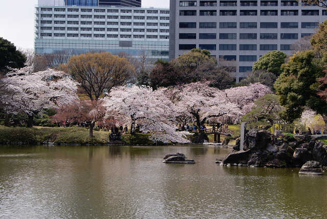 小石川後楽園は桜の本数は少ないですが、3本のしだれ桜があり、園内の入口を入るとすぐにそのしだれ桜が来園者を魅了します。
