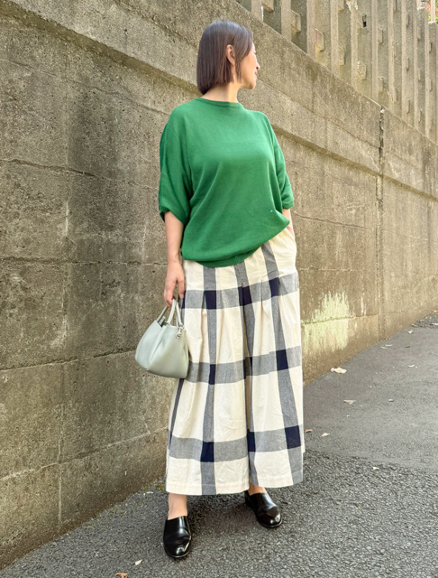 トレンドカラーのグリーンのニットに、モノトーンのチェック柄ガウチョパンツを合わせた落ち着きのあるコーデ。
