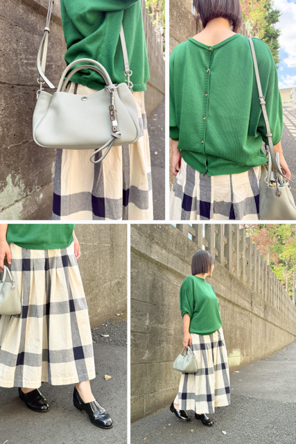 バッグもくすみグリーンで揃えることで、全体にまとまりが生まれ、季節感を引き立てます。
