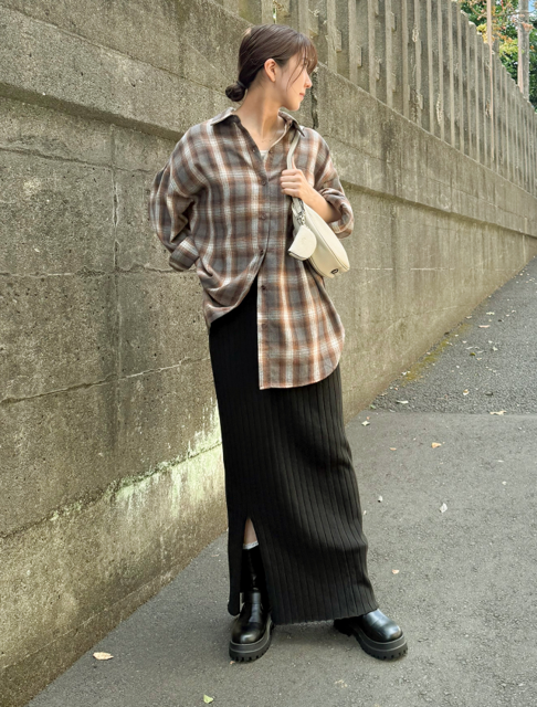トレンドのブラウンチェックシャツに、すっきりとしたブラックのニットタイトスカートを合わせた大人カジュアルコーデ。