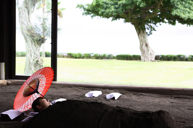 指宿の代名詞ともいえる「砂むし温泉」は、温泉の熱で温められた砂に全身を埋める入浴法で、浴衣を着たまま体験できます。
