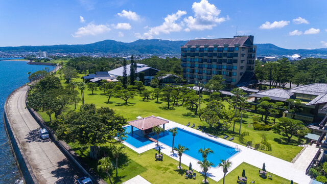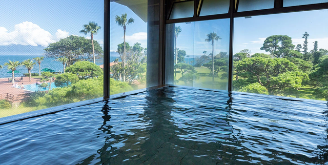 海沿いの広大な敷地からは錦江湾の絶景を望むことができ、約5万坪の敷地には指宿ならではの砂むし温泉や、日本の風呂の歴史を再現した元禄風呂があります。