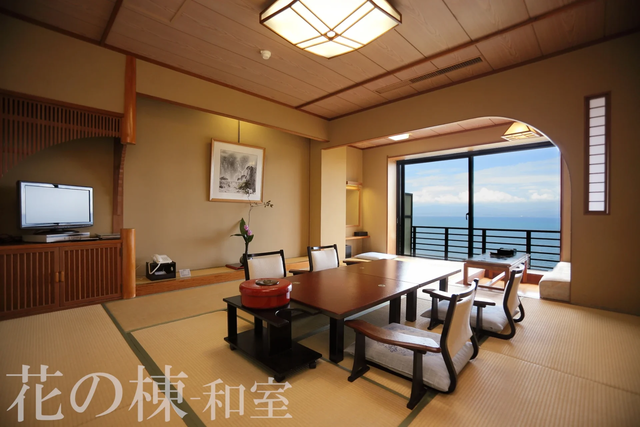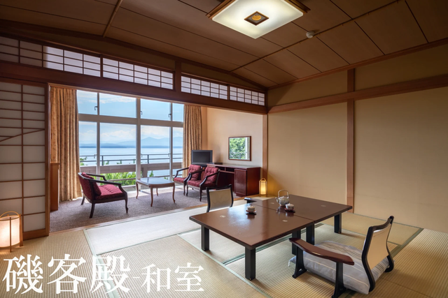 「磯客殿(いそきゃくでん)」全室海側に面し、檜風呂(源泉100%かけ流し内湯)付きの和室です。