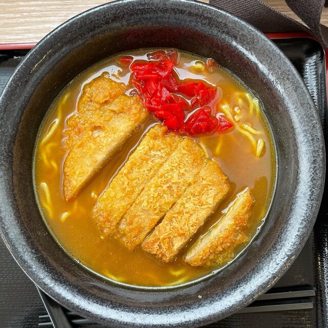 そんな有珠山SA(上り線)で食べられるおすすめご当地グルメが「カツのせ室蘭カレーラーメン」。室蘭のご当地ラーメンとして知られるカレーラーメンに、さっくり挙がったロースとんかつがトッピングされた一品です。