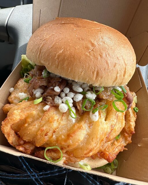 そんな津田の松原SA(上り線)でおすすめしたい、一風変わったご当地グルメが「さぬき肉うどんバーガー」。香川県の名物のうどんを、大胆にバーガーにした一品です。