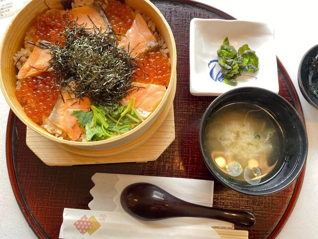 そんな越後川口SA(下り線)で食べられるおすすめご当地グルメが「あねさわっぱ飯」。薄口のだし醤油で味付けした茶飯の上に、鮭とイクラをのせた新潟郷土料理です。