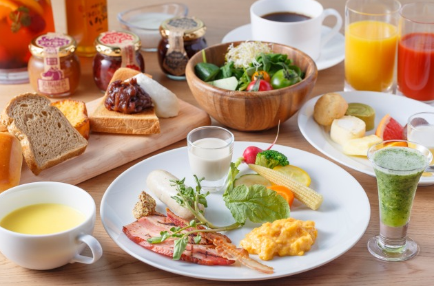 3階のレストラン「FOREST KITCHEN with Outdoor Living」では、朝食に和洋ブッフェを提供。東北産の食材を使用したサラダやスクランブルエッグ、天然酵母パンなど素材にこだわったヘルシーなメニューで、元気に一日をスタートできます!