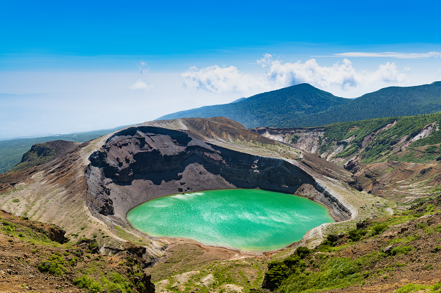 美しいエメラルドグリーンの水面と、荒々しい火口壁とのコントラストが神秘的な印象の「蔵王御釜」。