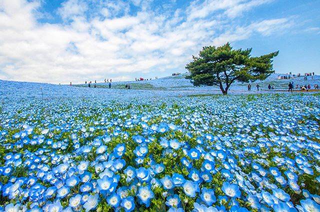ネモフィラ、空、海が織りなす青のグラデーションは、言葉を失うほどの絶景です。