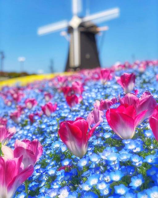 風車の丘には春にはネモフィラとチューリップの絶景が楽しめます。