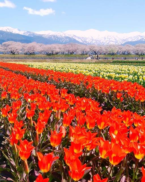 地元の農家さんが桜に合わせたチューリップと菜の花を栽培し、残雪の朝日岳・白馬岳を背景に、桜並木とチューリップ、菜の花の奇跡的に揃う「四重奏」を楽しめます。