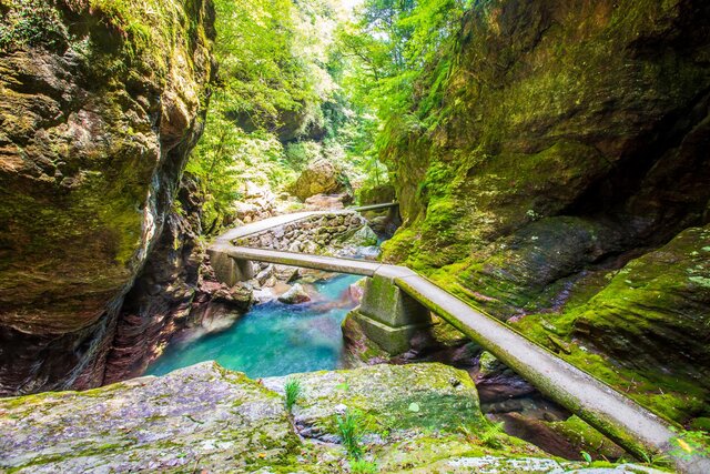 穏やかな川の流れと、エメラルドグリーンに輝く水の色が特徴。夏は青空、秋は紅葉とのコラボレーションを楽しめ、自然を五感で味わうのにピッタリ!