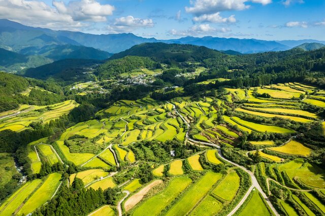 高知県中部に位置する棚田アートで有名な観光地。周囲を山に囲まれており、600年以上も前に作られたのどかな田園風景が広がっています。