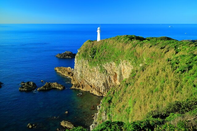 足摺宇和海国立公園に位置する、断崖絶壁の岬。先端には高さ約18mの灯台があり、白亜の建物と紺碧の太平洋が絶景のコラボレーションを作り出しています。