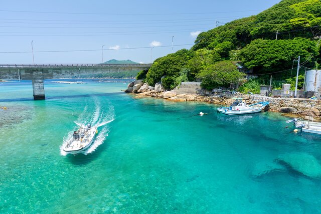本島とは2本の橋でつながっている、周囲約4kmの小島。透明度の高さは県内随一ともいわれており、まるで舟が浮かんでいるような絶景と出会えます。