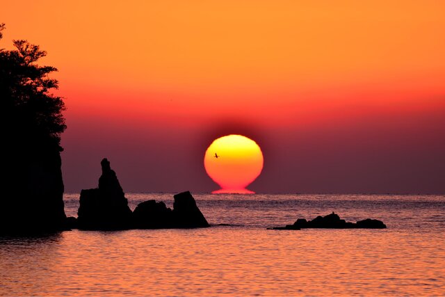 だるま夕日を見られるのは、冷え込みの厳しい11月中旬〜2月ごろ。よく晴れた夕方のわずか3分間しか現れない貴重な景色なため、見ると幸せになれるとのジンクスもあります。真っ赤に輝く夕日と雄大な海との調和は、息を飲む絶景ですよ♡
