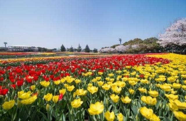 なばなの里内にある国内最大級の花園「花ひろば」。180万球のチューリップと、春の花々が咲き誇る。赤・白・黄色、ピンクから、珍しい色や形のチューリップまで勢揃い。
