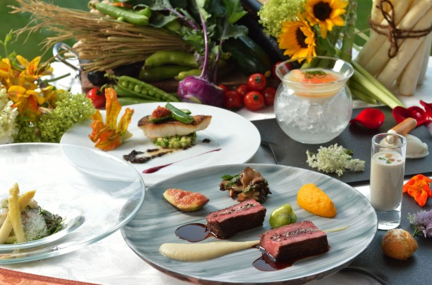 「レストラン 桂姫」では、信州の新鮮な食材を使用したフランス料理を提供。コースは、メインを魚料理または肉料理から選べる4品のLe Cielと、シェフオリジナルの6品のLa Luneの2種類。信州ワインをはじめ、フランスやイタリアのワインとのマリアージュを堪能できますよ♡
