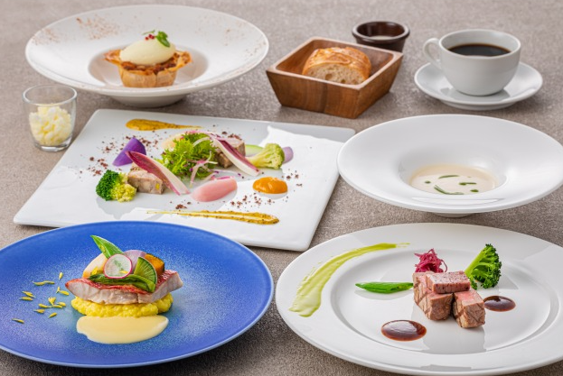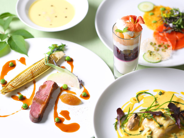 ディナーでは、季節の味覚を堪能できるフレンチ風の会席コース、創作フレンチのフルコース、そして贅沢なアップグレードコースを提供。アップグレードコースにはシャンパンとお祝いデザートが付き、お祝いをさらに盛り立てることができます♡