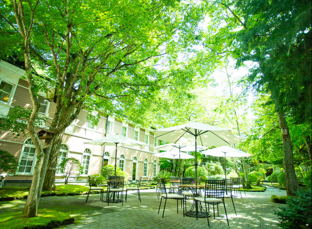 「旧軽井沢ホテル音羽ノ森」は、旧軽井沢銀座通りから徒歩約7分のところにあるホテル。飲食店や土産物店が軒を連ねる賑やかな通りから一本入った自然豊かな環境にあり、静かな滞在を楽しめます。