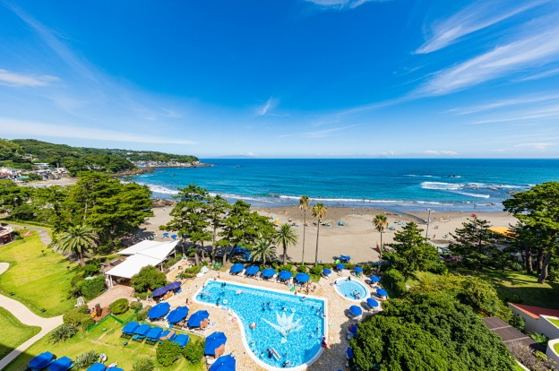 「伊豆今井浜東急ホテル」は、透明度が高いことで知られる今井浜海岸に建つリゾートホテル。夏は海とプールの両方で水遊びを楽しめます。