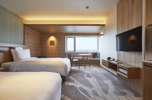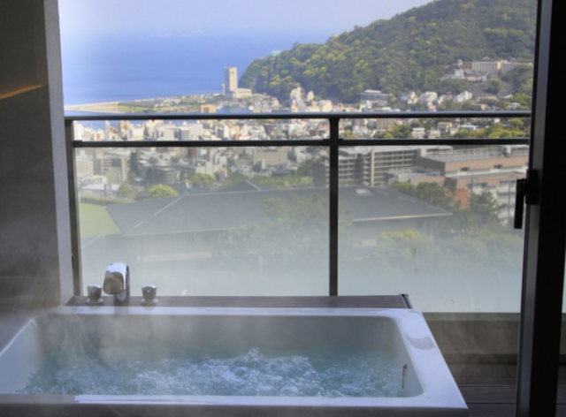 客室はフルハイトウィンドウを配した開放的な空間で、パノラマビューを独占できるのが魅力。絶景を満喫するならバルコニーにベンチを備えた「日本平ツイン」、おこもりステイならはビューバスを完備している「スイート」がおすすめです!