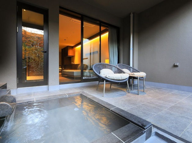 和洋折衷の湯宿で、客室は和の趣とベッドの機能性を備えた和モダン空間。客室風呂や宿泊者専用の半露天風呂で温泉に浸かれるほか、愛犬と一緒に宿泊できるのが魅力です!