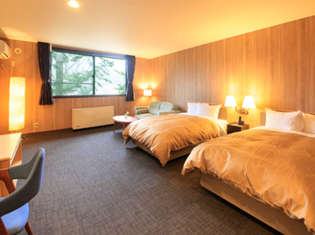 客室は、白や木目を基調とした周辺の自然によく馴染む内装。ツイン・和室・和洋室があり、旅の目的や好みに合わせて選べます!