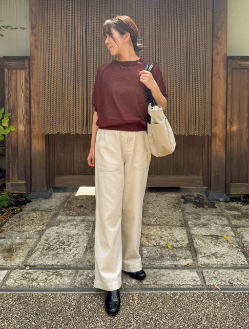 1日目は、やわらかなブラウンの半そでニットを合わせた上品カジュアル。
